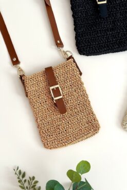 BECCASTYLE Telefon Çantası, Küçük Çapraz Askılı Çanta, Örgü Hasır Çanta, Yazlık Rafya Çanta, El Yapımı Çanta