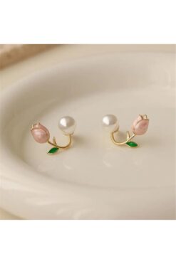 DEMOKAN Kadın Küpe İncili Lale Model 14k Gold Minimal Tasarım Küpe