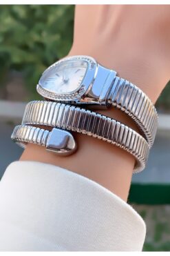 Merand Gümüş Renk Beyaz Kadran Yılan Saat, Dolamalı Saat, Kadın Kol Saati