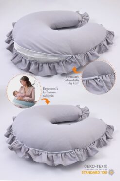 Umaybebek Emzirme Yastığı Minderi, Pamuk Kumaş – Gri Fırfırlı