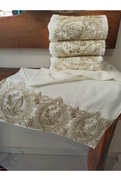 ŞENER HOME Yaprak Dantelli Çeyizlik Kadife 50×90 El&yüz Havlusu – Kreme Kahve