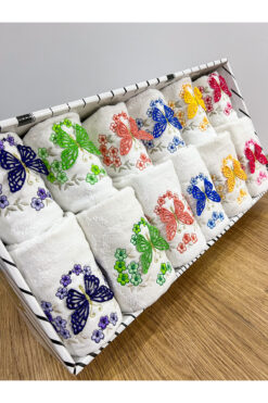AYHANHOME 3d Kelebek Nakış Işleme Desenli Kutulu Çeyizlik Hediyelik 12’li 6 El Yüz & 6 Mutfak Havlu Seti