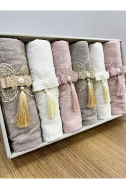 AYHANHOME 6’lı Fiyonklu Püsküllü Kutulu Çeyizlik 50×90 Kadife El ve Yüz Havlusu