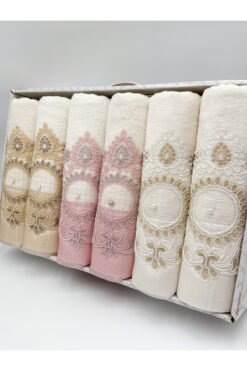 AYHANHOME Güpürlü Saten Işlemeli Kutulu Lüks Çeyizlik 50×90 6’lı El Yüz Havlu Seti