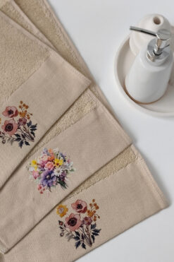 Sevim 3’lü Çiçek Baskılı Havlu Takımı – Bej Renk Bambu El Havlusu Seti – Yumuşak & Süper Emici – 30×50 Cm