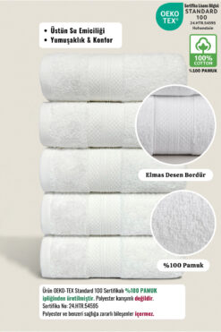 Ellaline 5’li Havlu Seti %100 Pamuk Sertifikalı, El Yüz Mutfak Havlusu Takım Elmas Desen Bordür Beyaz 50x80cm