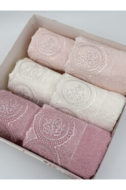 AYHANHOME Fransız Güpürlü Taşlı Kutulu Çeyizlik 3 Adet 50×90 El Yüz Havlusu 3 Adet 30×50 Mutfak Havlu