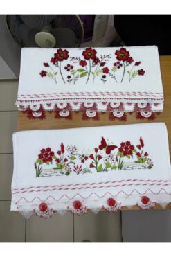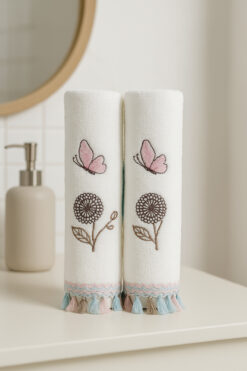 KAYABEY HOME 2’li Kelebek Nakışlı Püsküllü El Havlusu Seti – 30×50 cm %100 Pamuk Krem Renk