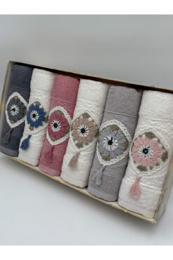 AYHANHOME 6’lı 3d El Işleme Çiçek Nakışlı Püsküllü Kutulu Çeyizlik 50×90 El Yüz Havlu Seti
