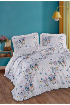 Uckan %100 pamuk çift kişilik nevresim takımı fırfırlı süs dikişli mavi çiçek desen
