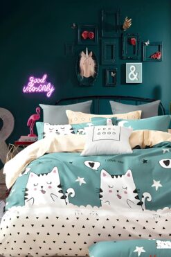 İQON Lastikli Çarşaflı Nevresim Takımı Tek Kişilik Sevimli Kediler Petrol