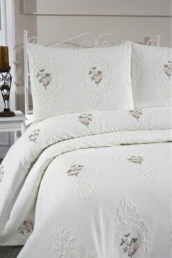 Çeyiz Diyarı Gardenlove Nakışlı Şönil 3 Parça Çift Kişilik Yatak Örtüsü Krem