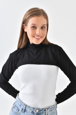 mirach Siyah Dik Yaka Boyunluklu Kolluk Penye Pamuk Bolero Crop Yarım Balıkçı Boyun Uzun Kol