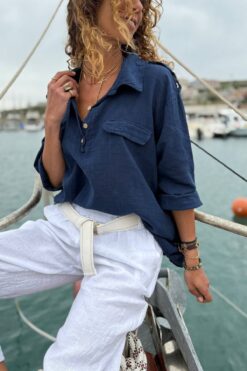 Güneşkızı İtalyan Lacivert Düğmeli Yaka Çift Kapaklı Cepli Apoletli Safari Keten Salaş Dokuma Bluz 70 63