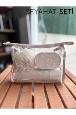 ARVALE PARIS Seyahat Seti | Duş Lifi, Sabunluk, Tarak & Makyaj Kutusu – Şeffaf Taşınabilir Çanta