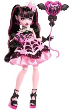 MONSTER HIGH ® DOĞUM GÜNÜ™ DRACULAURA™ Bebek Parti elbiseli ve bir elinde balonla JBG74