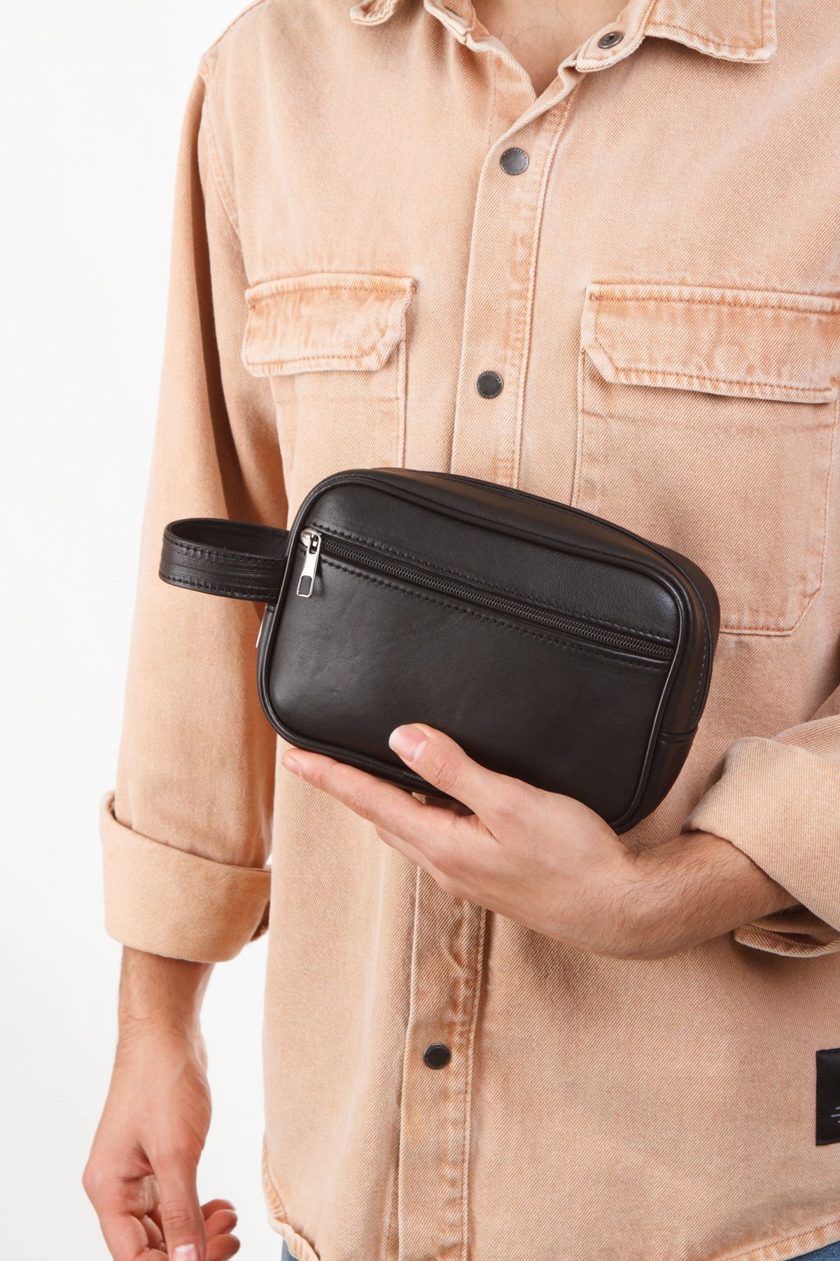 – Yüksek kaliteli %100 kuzu derisinden üretilmiş, dayanıklılığı ve şık görünümü ile dikkat çeken erkek siyah hakiki deri el çantası.