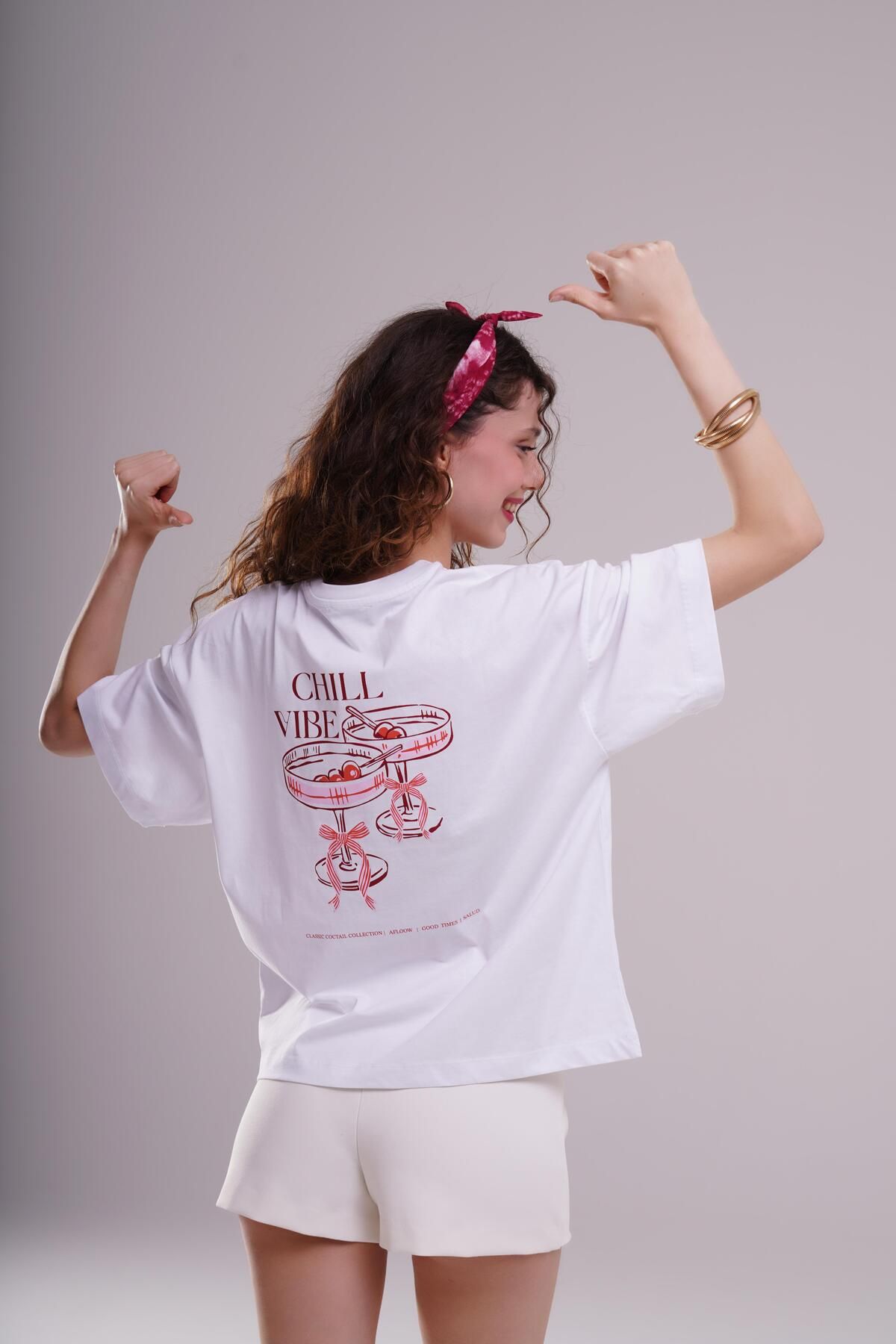 AFLOOW Kadın Beyaz Oversize Tişört – Chill Vibes Baskılı