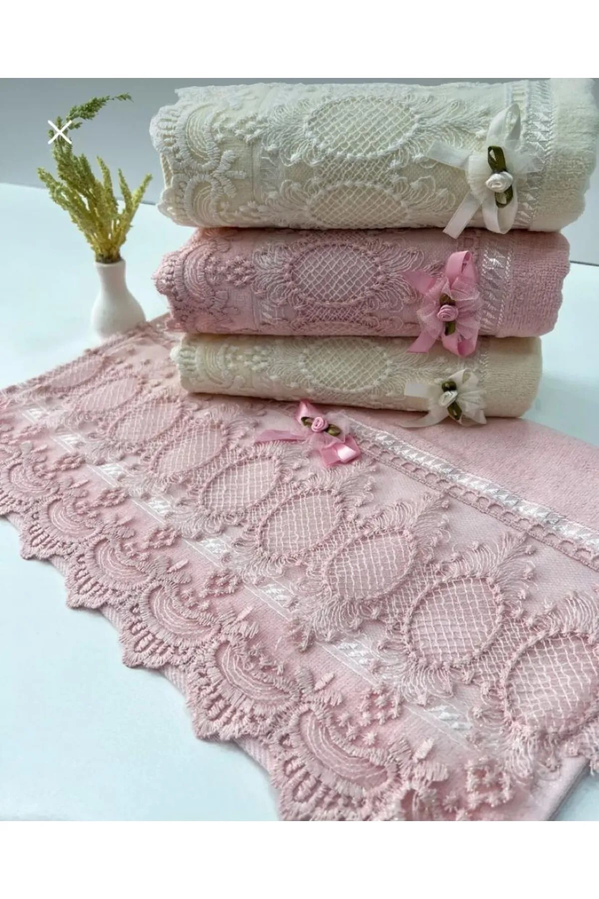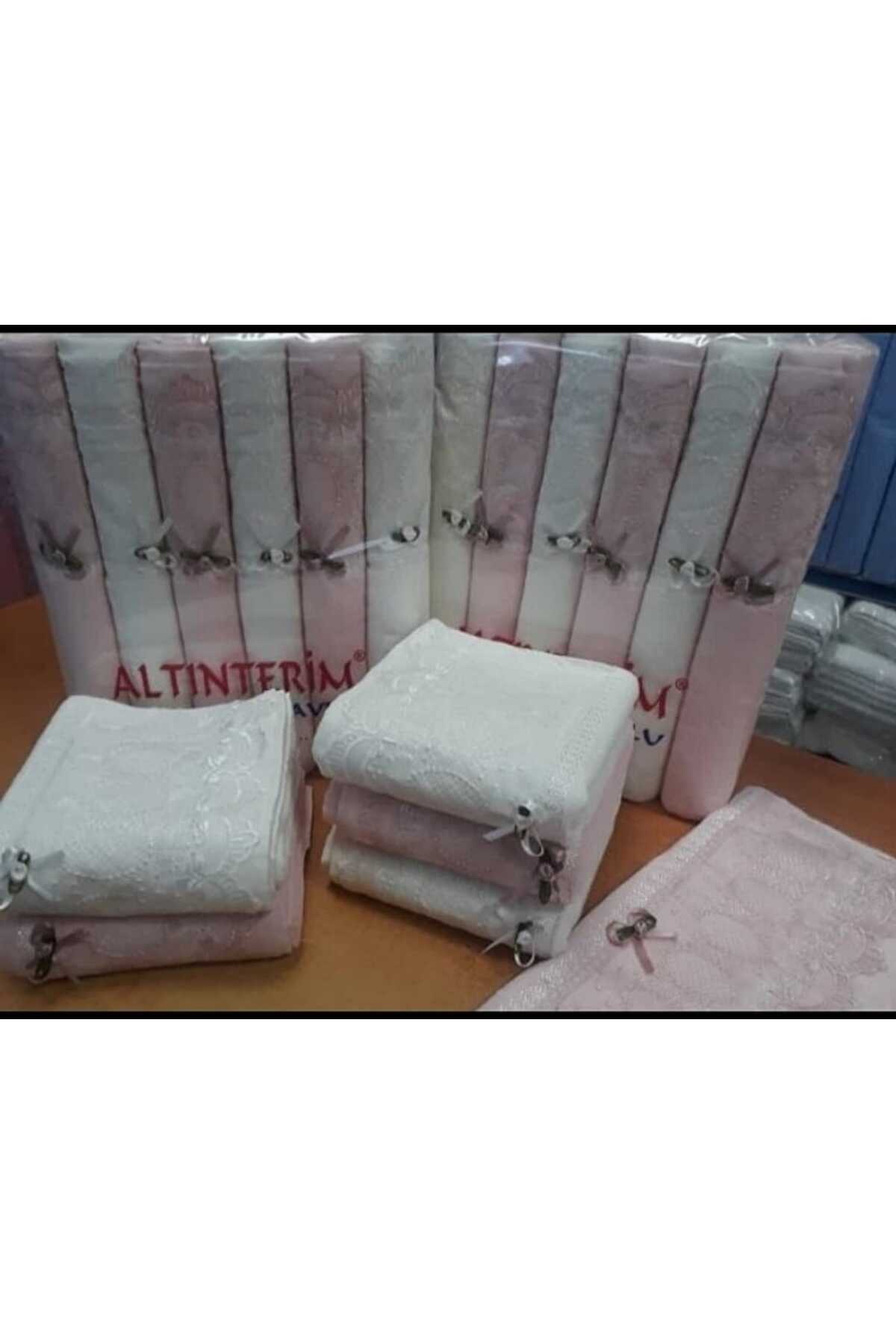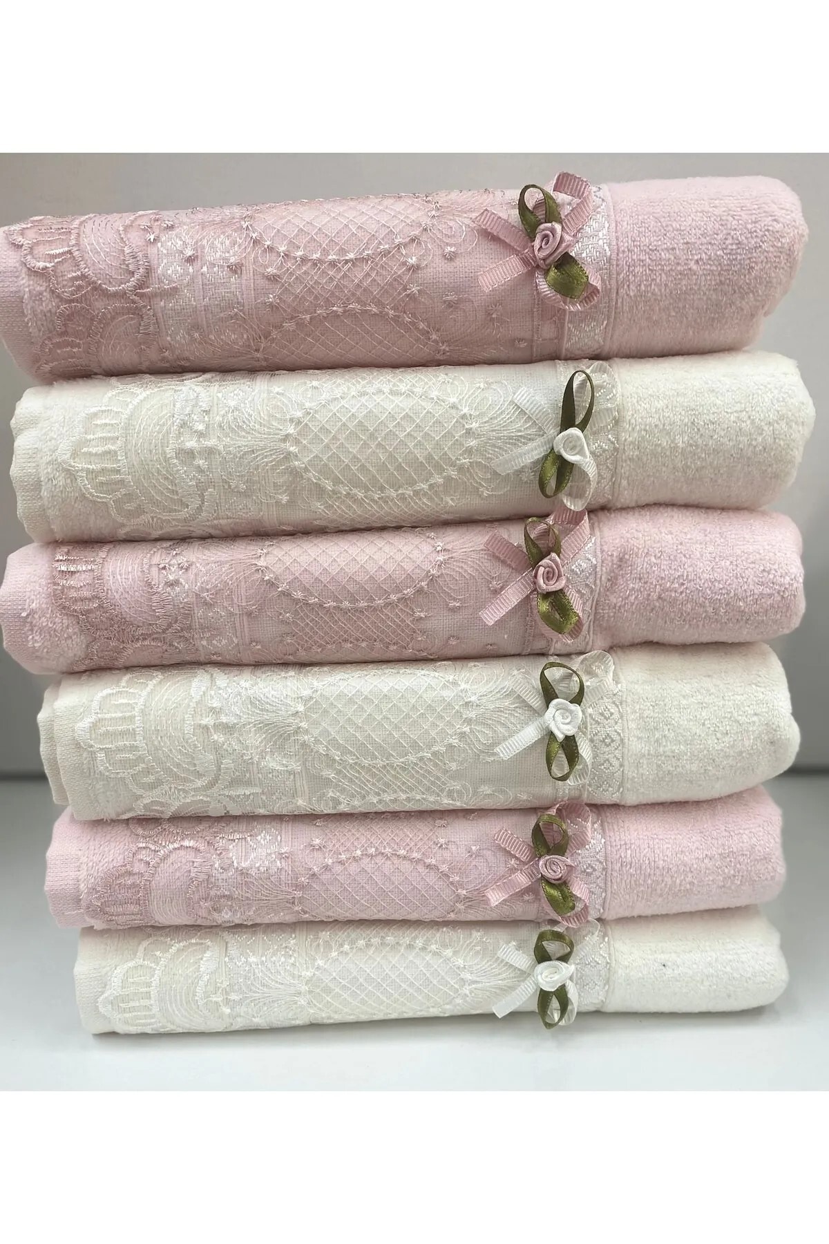 akınabella ÇEYİZLİK GÜPÜRLÜ KURDELELİ PAMUK 6 ADET BEYAP PEMBE HAVLU