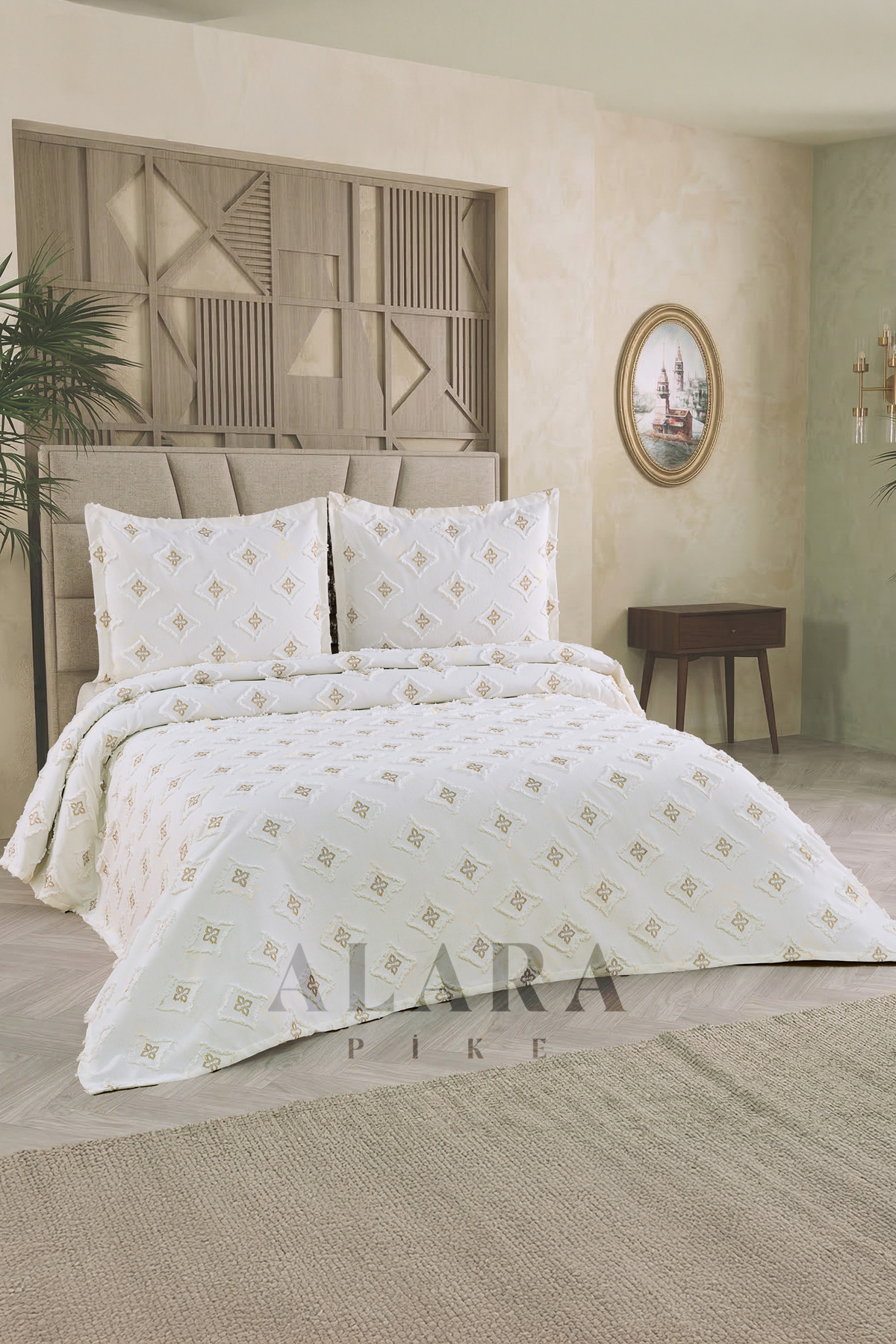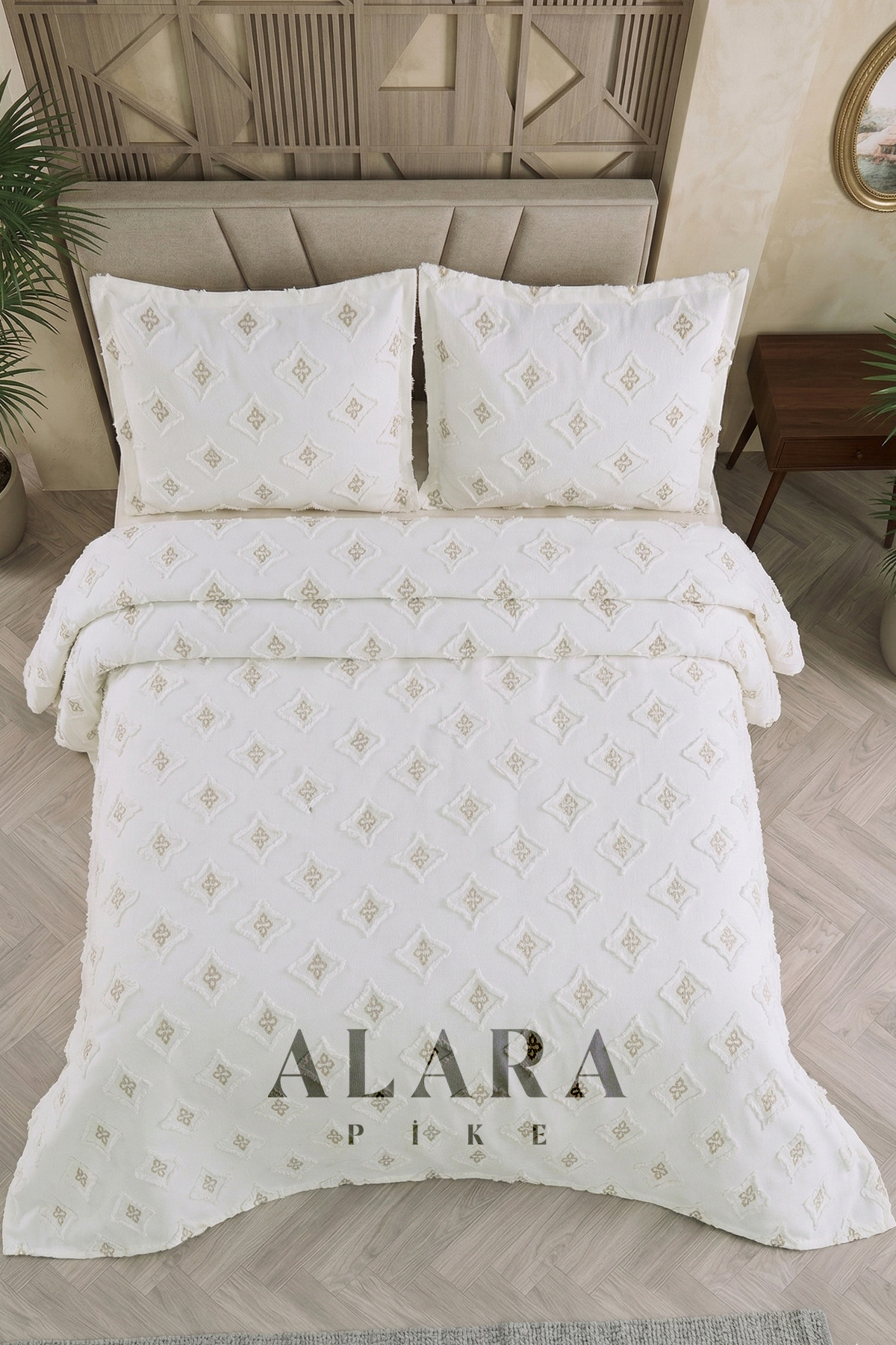 REYS Kapitoneli Çift Kişilik Yatak Örtüsü Takımı 230×250 50×70 2 Adet Yastık Kılıfı Ekru