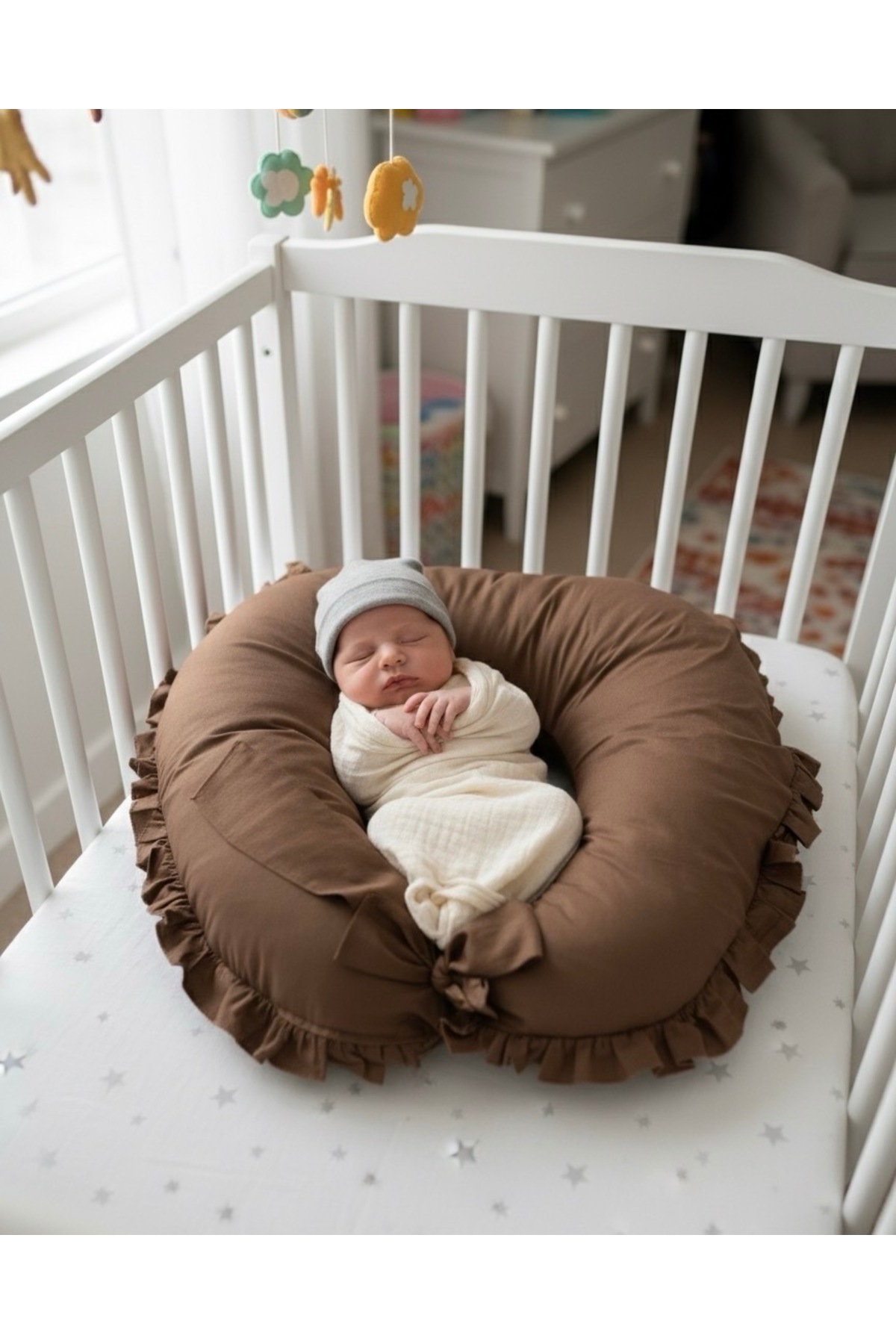 Umaybebek Emzirme Yastığı Minderi – %100 Pamuk – Kahve Fırfırlı