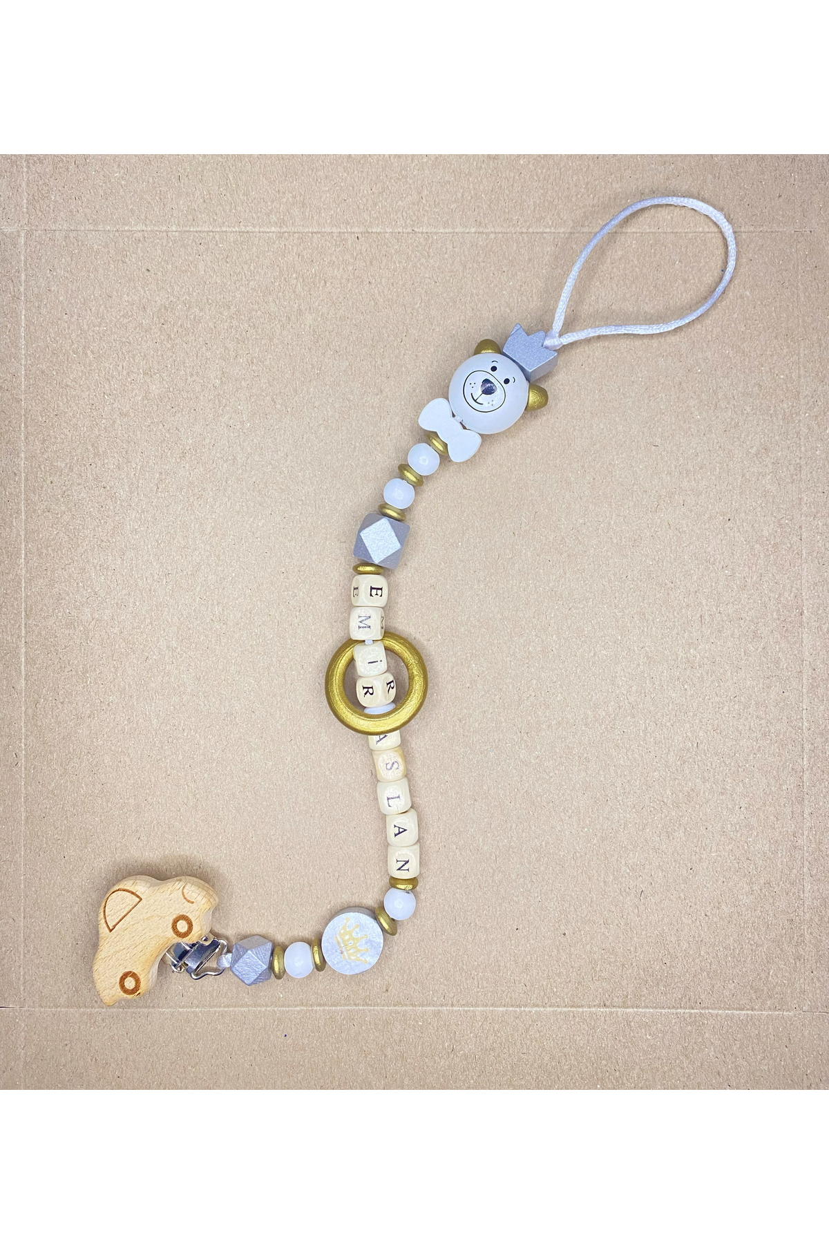Ari baby textile atelier İsimli Emzik Zinciri-Doğal Ahşap Emzik Askısı- Bebek Emzik Tutucu-Bebek Hediyesi