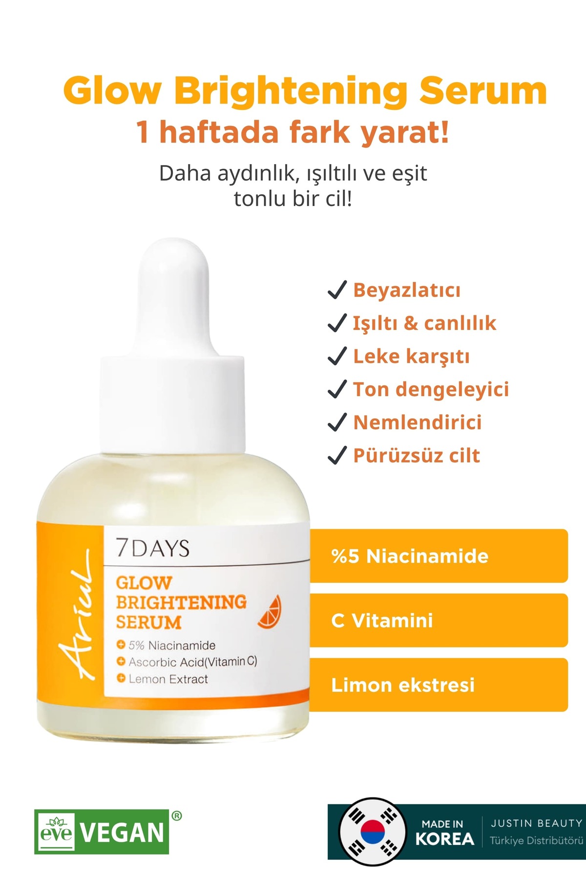 Ariul 7 days Glow Brightening Serum 20ml – & Ton Eşitleyici %5 Niasinamid Vegan Serum