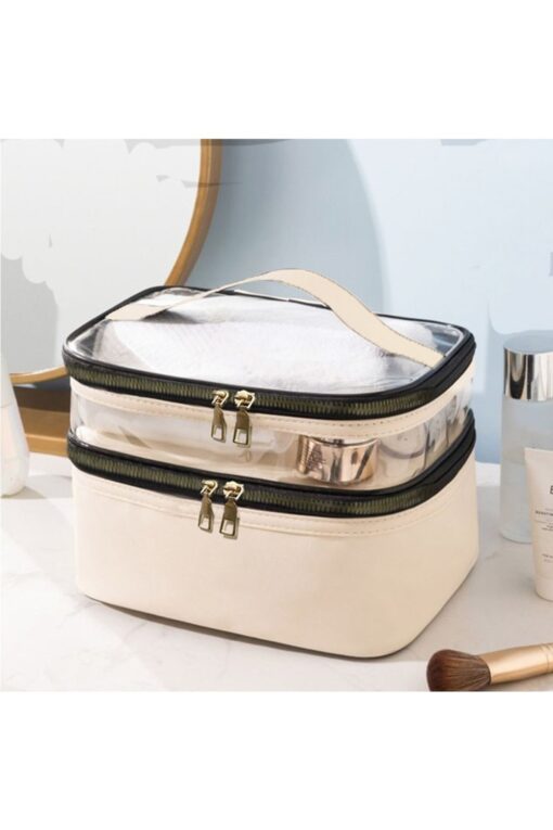Arnee Kadın Makyaj Çantası Bej Deri Şeffaf Pratik Şık Çift Bölmeli Fermuarlı Seyahat Makyaj Çantası en ucuz fiyata kozmetikara.com sitemizden sipariş verebilirsiniz.