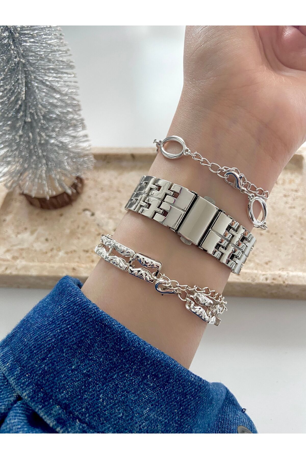 Kadın kol saati metal kordon gümüş renk bileklikli kombin saat SET İÇERİĞİ *1 adet saat *2 adet bileklik