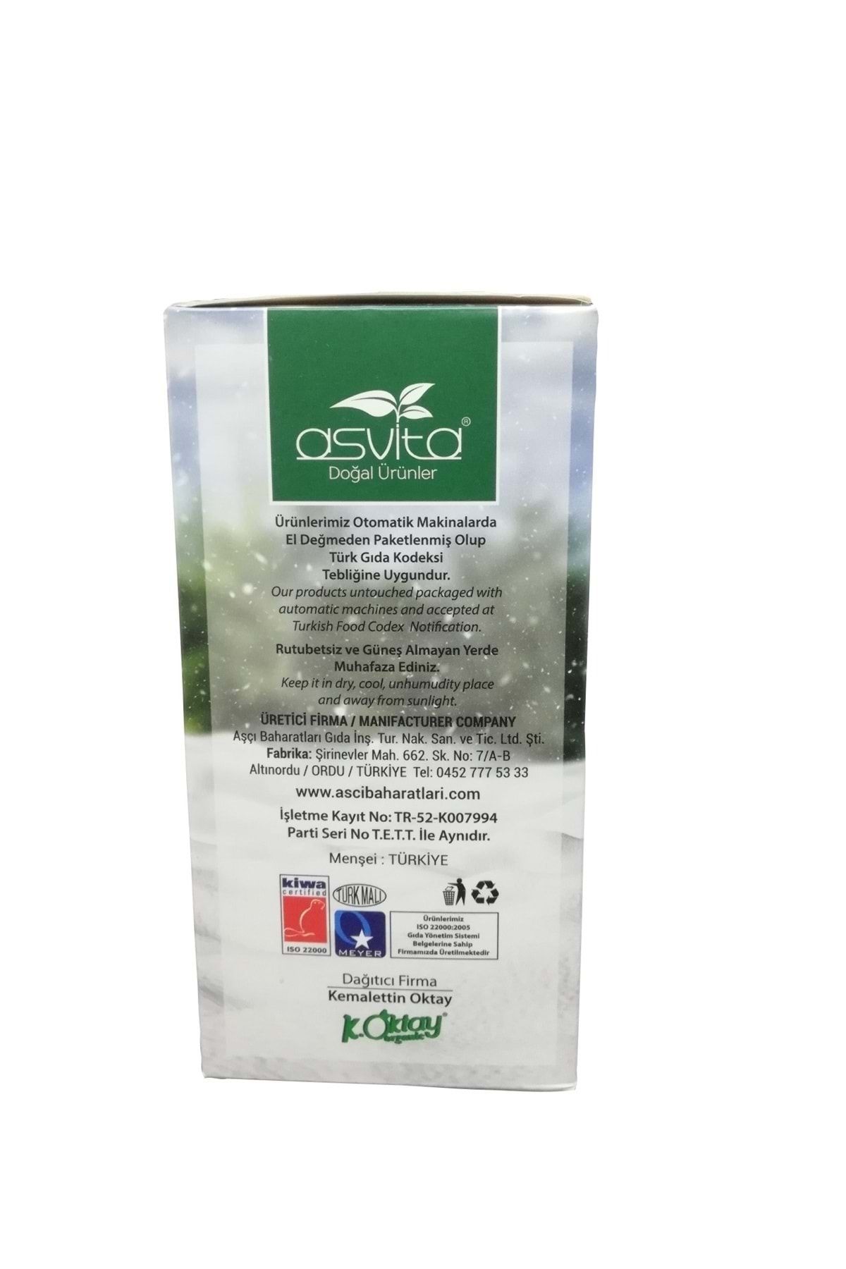 asvita Doğal Ürünler İçindekiler: Stevia, Tarçın, Karanfil, Zencefil, Zerdeçal, Ayva Yaprağı, Meyan Kökü, Havlican, Kuşburnu, Okaliptus Contents: Stevia, Cinnamon, Colve, Ginger, Turmeric, Quince Leaf, Licorice Root, Galangal, Rosehip, Eucalyptus Kullanım Bilgisi: 1 Süzen poşeti fincanınıza koyup üzerine taze kaynamış su ilave ediniz.