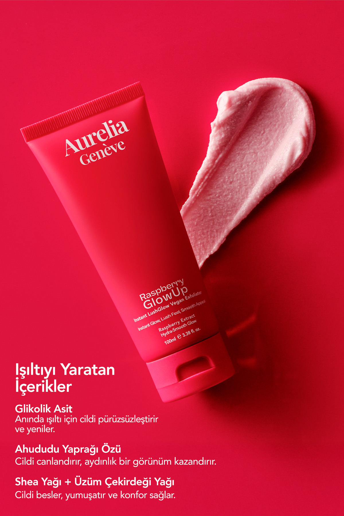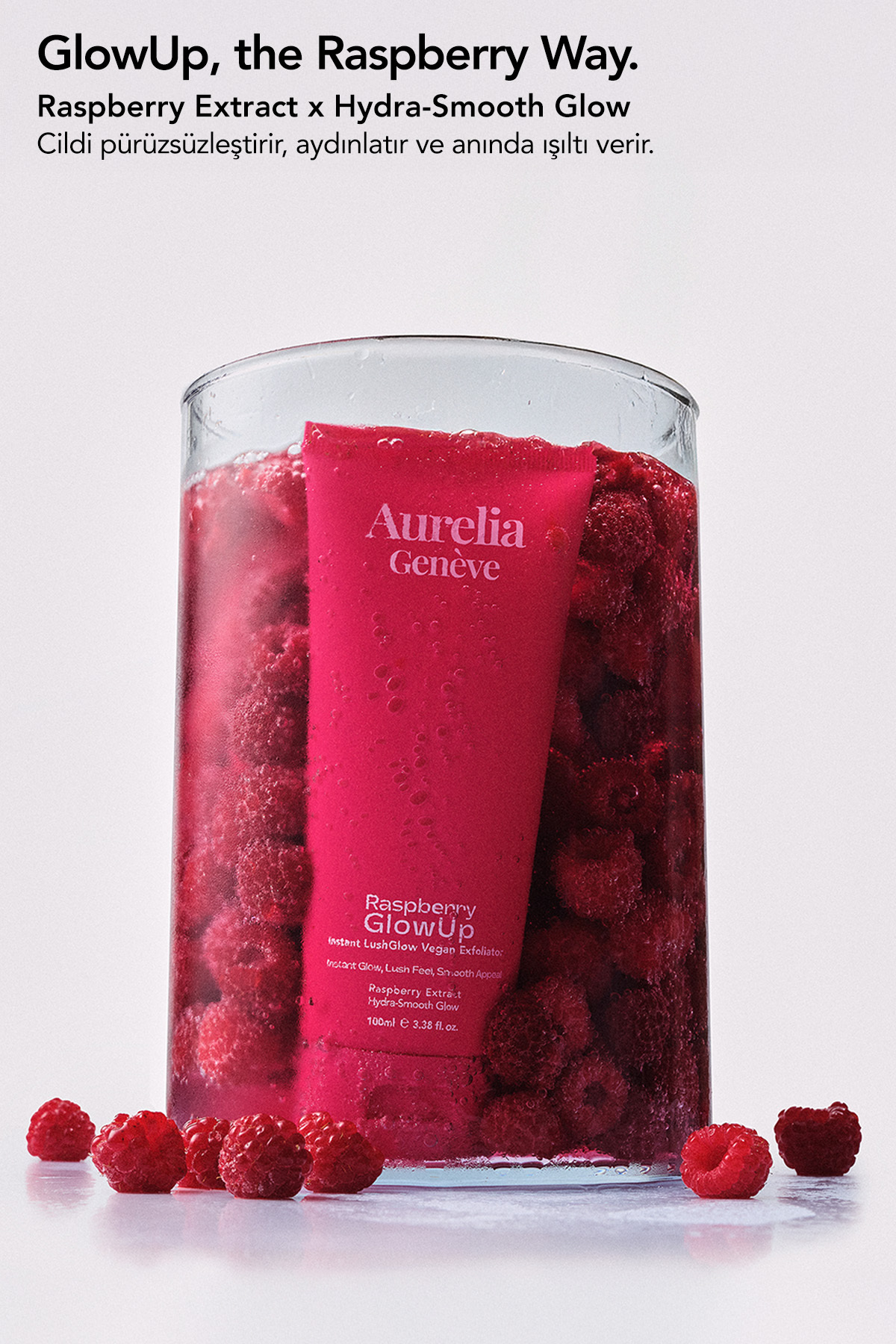 Aurelia Genève Raspberry GlowUp Instant LushGlow Vegan Exfoliator – Cildi Derinlemesine Arındıran & Işıltı Kazandır