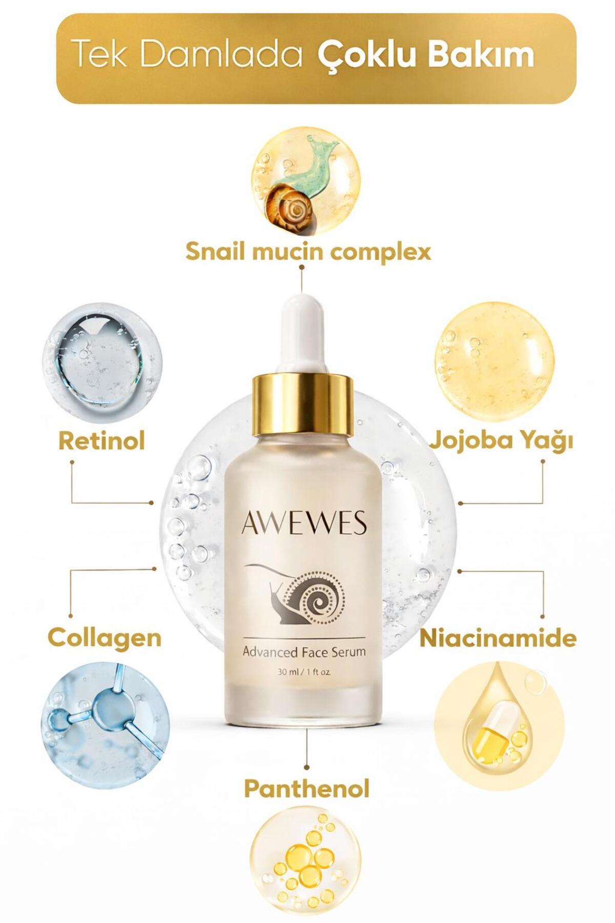 awewes Yaşlanma & Leke Karşıtı Ton Eşitleyici Salyangoz özlü- Niacinamide – Panthenol Yüz Serumu 30 ML