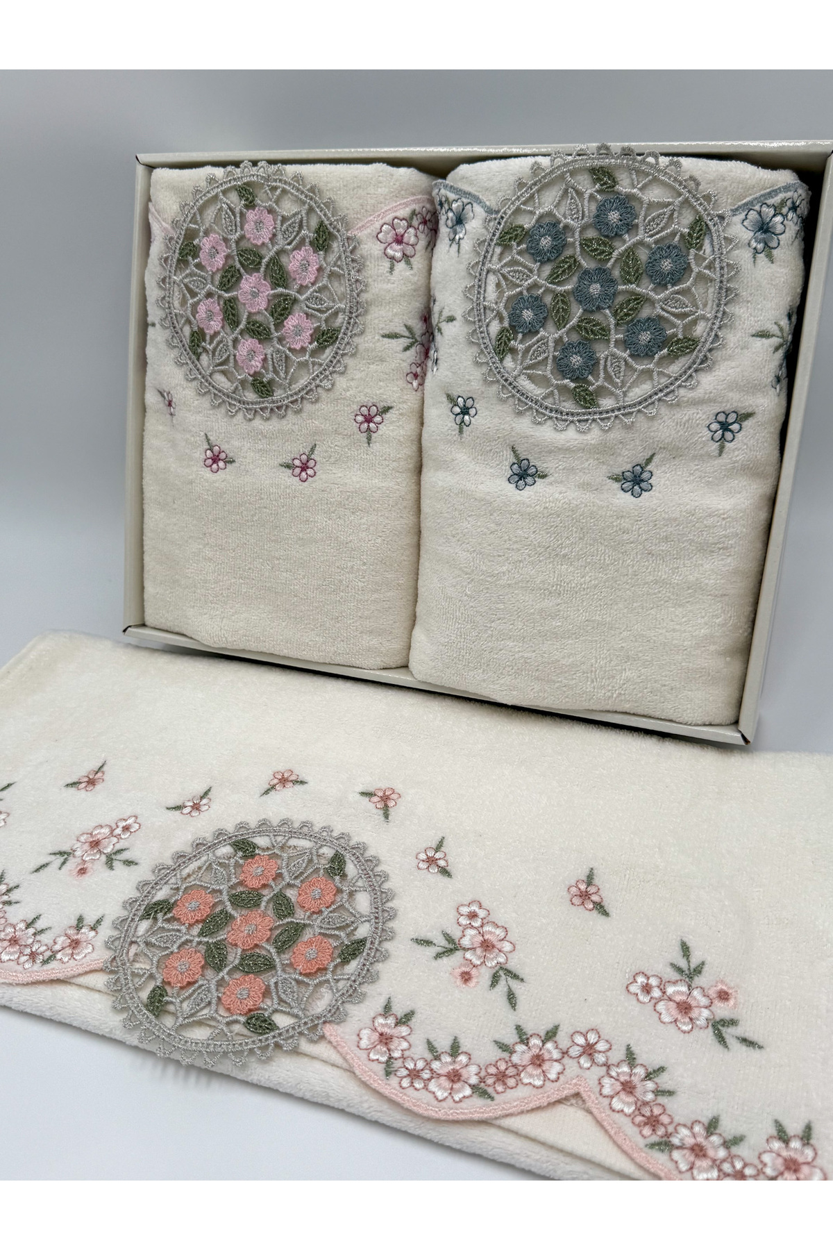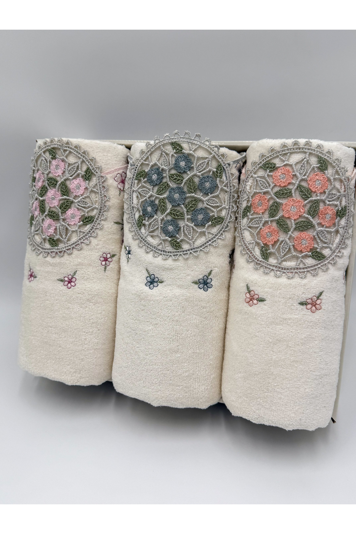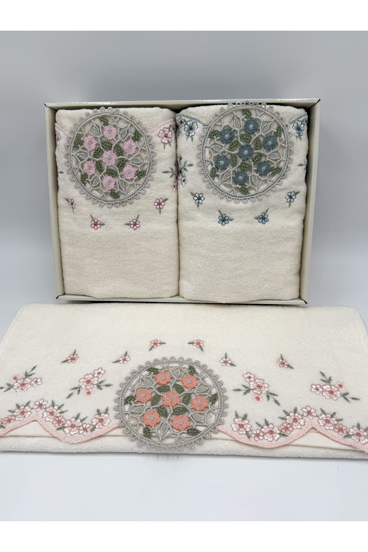 AYHANHOME 3 Adet Kadife Lüks Fransız Güpür İşlemeli Kutulu Çeyizlik 50×90 El ve Yüz Havlusu