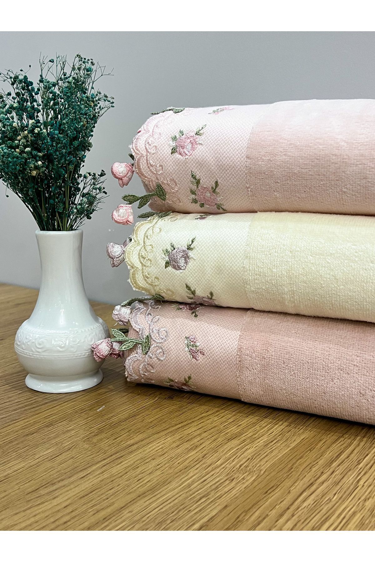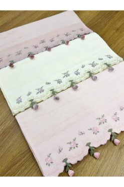 AYHANHOME 3’lı Küpeli Çiçek İşleme Renkli Çeyizlik 50×90 El Yüz Havlu Seti