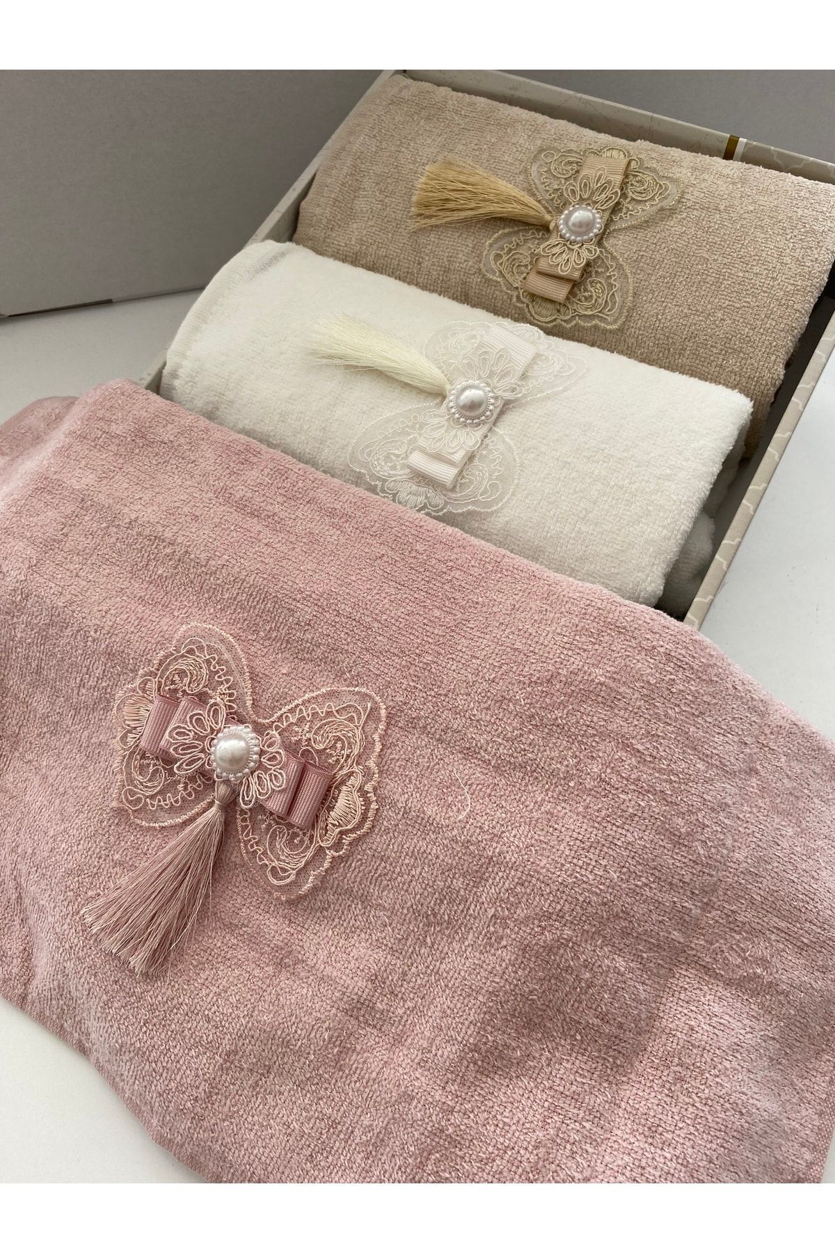 AYHANHOME 3’lü Fiyonklu Püsküllü Kutulu Çeyizlik 50×90 Kadife El Ve Yüz Havlusu