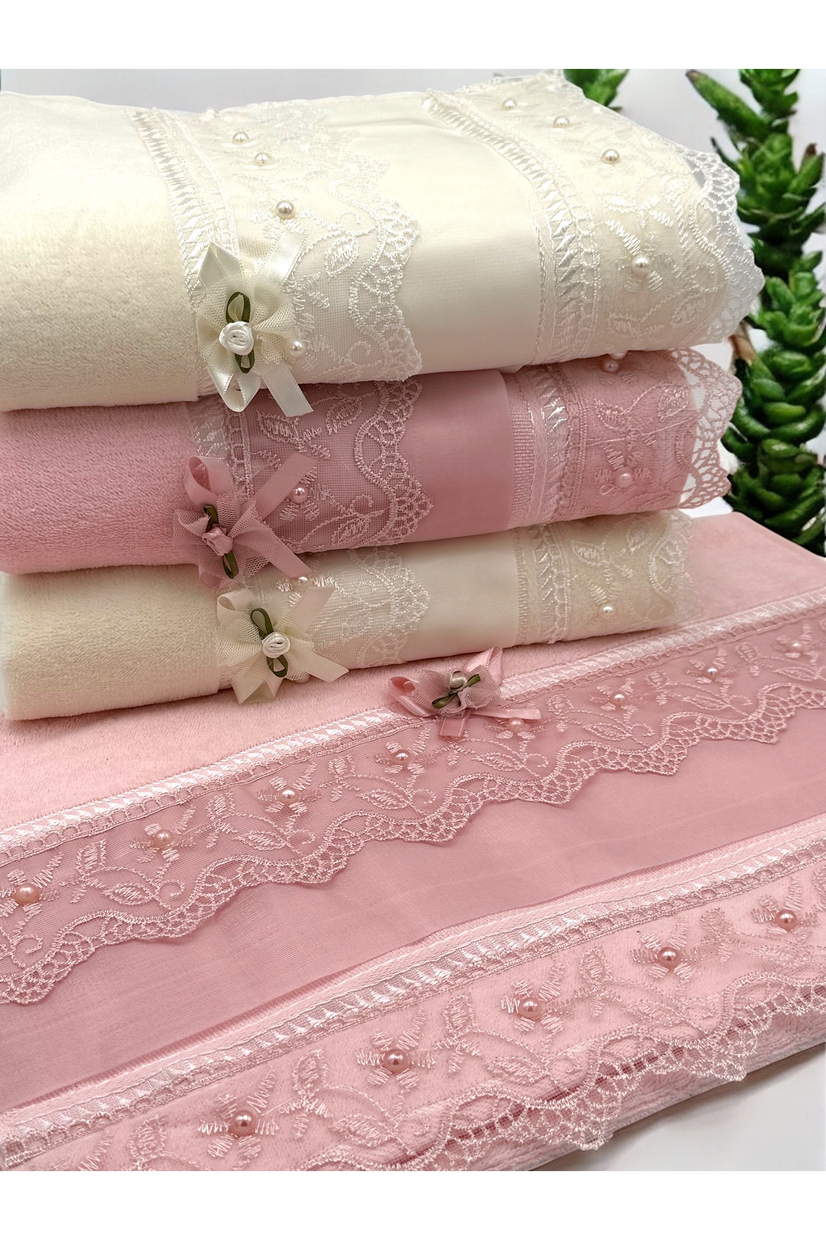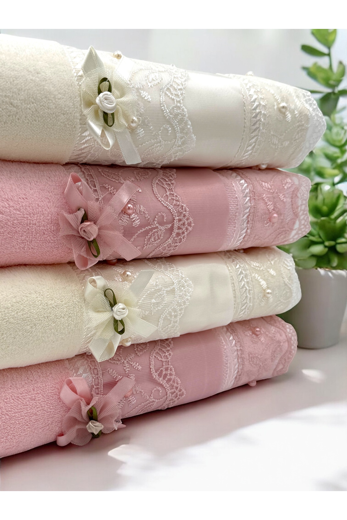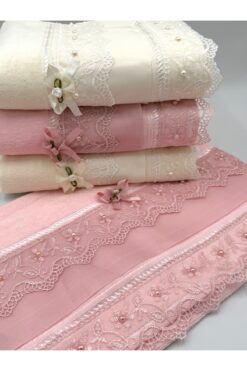 AYHANHOME 4’lü %100 Pamuklu Jakarlı Kadife Dantelli Güpürlü Fiyonklu Çeyizlik 50×90 El Ve Yüz Havlusu