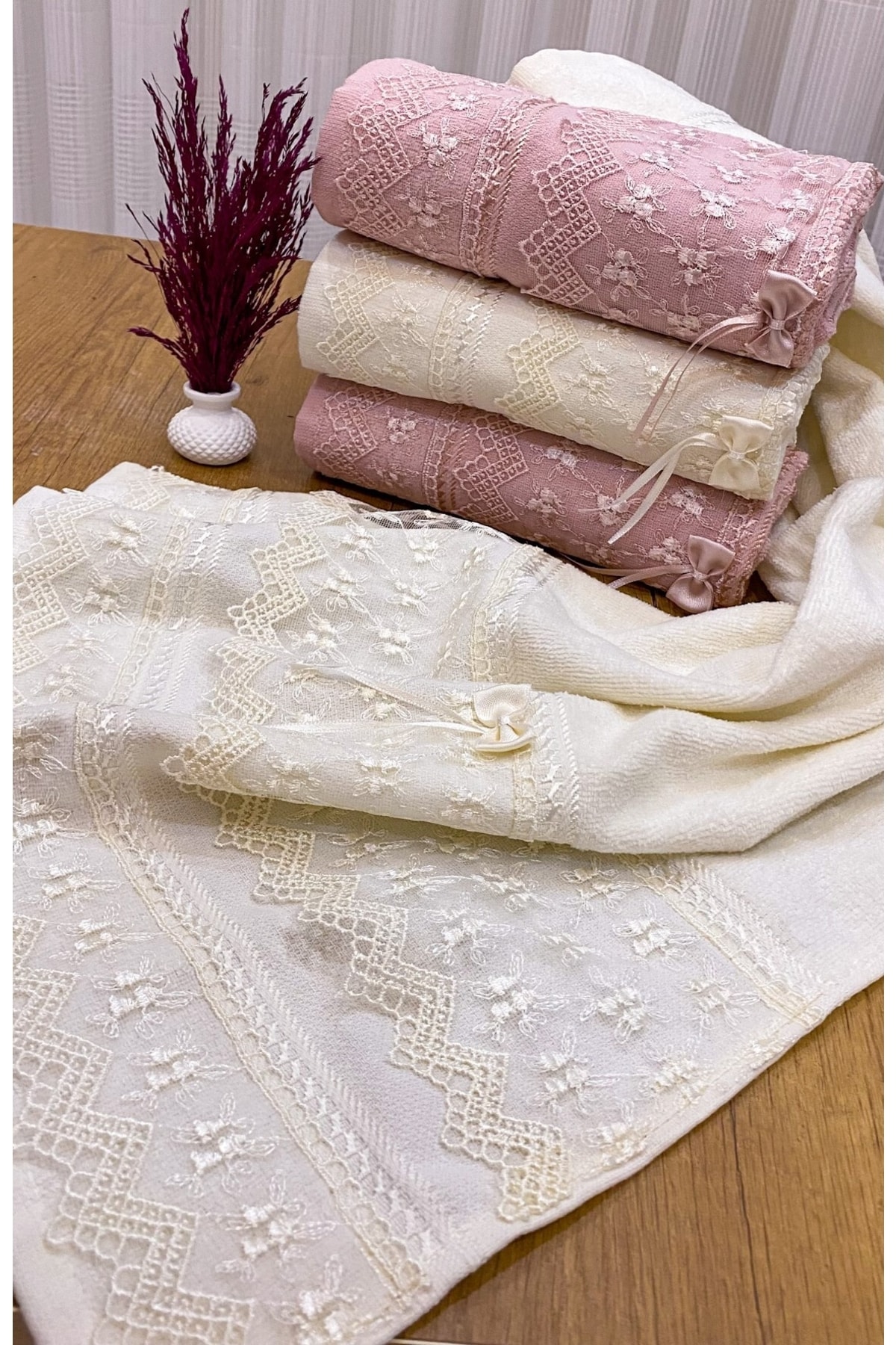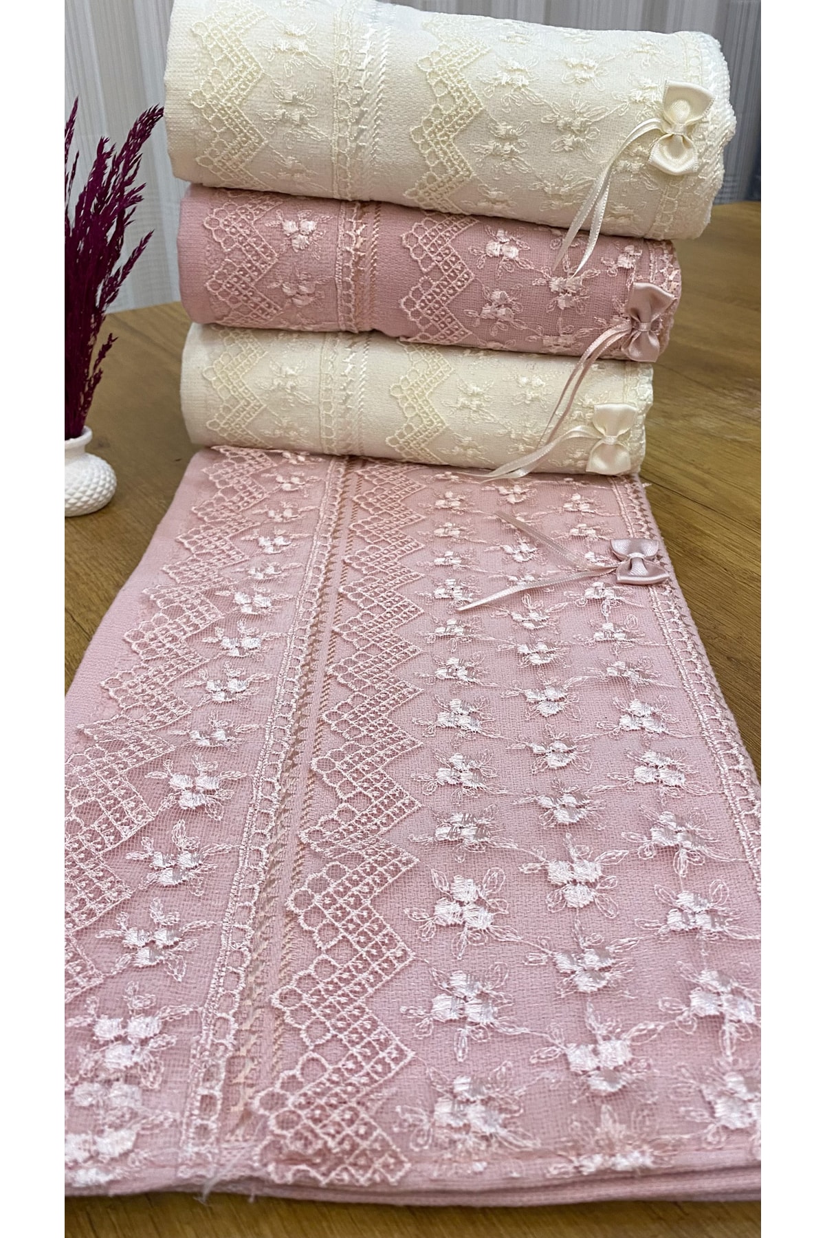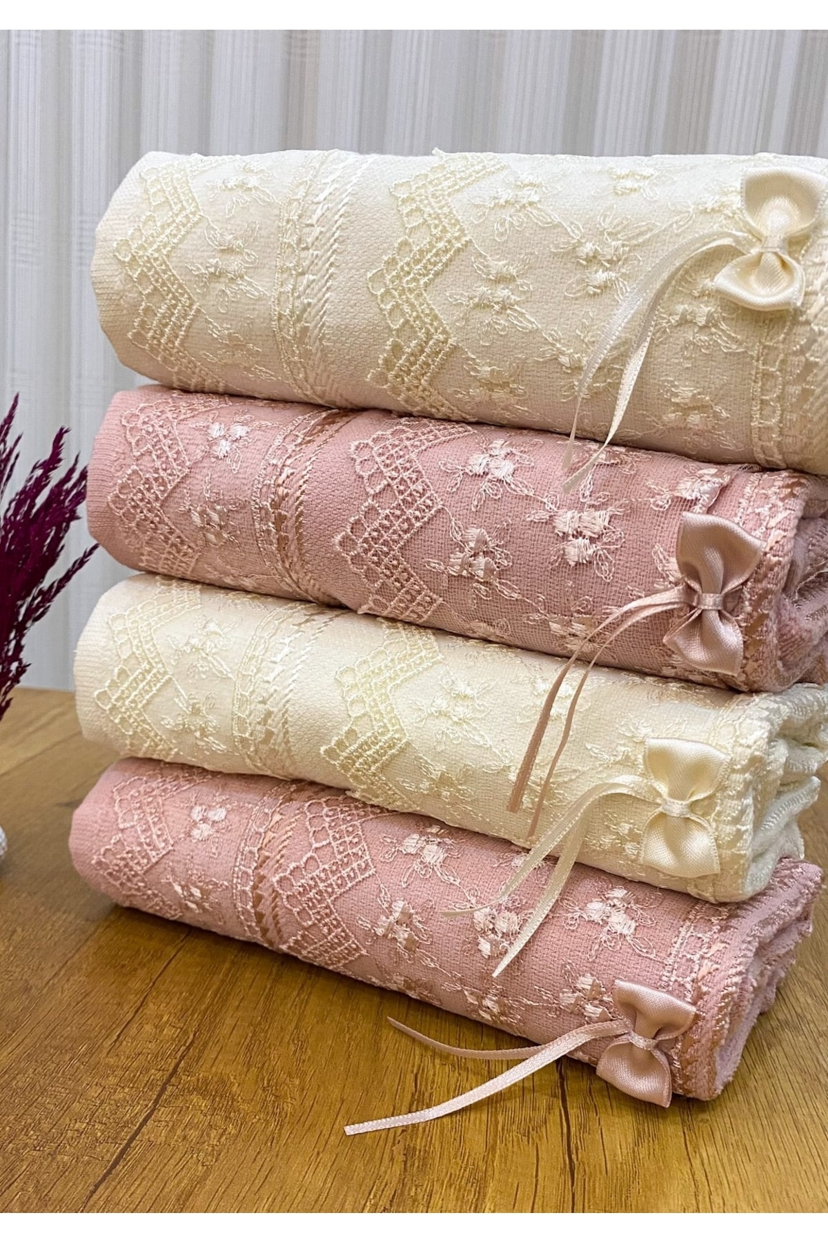 AYHANHOME 50×90 4’lü %100 Pamuklu Kadife Güpürlü Fiyonklu Desenli Havlu