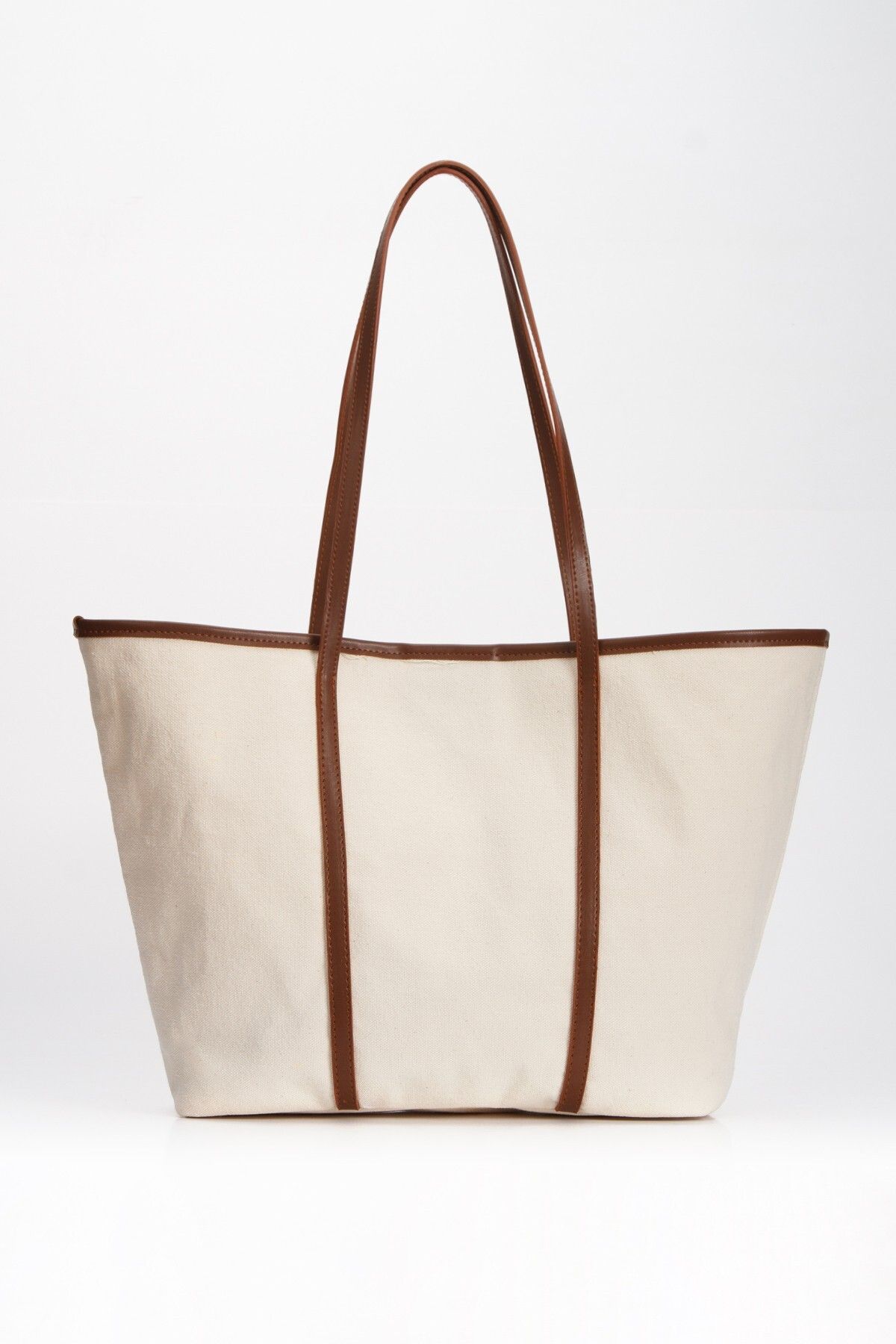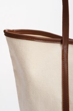 Bej renkli dayanıklı kumaşı ve kahverengi uzun omuz askılarıyla dikkat çeken bu çanta, günlük kullanım için idealdir.