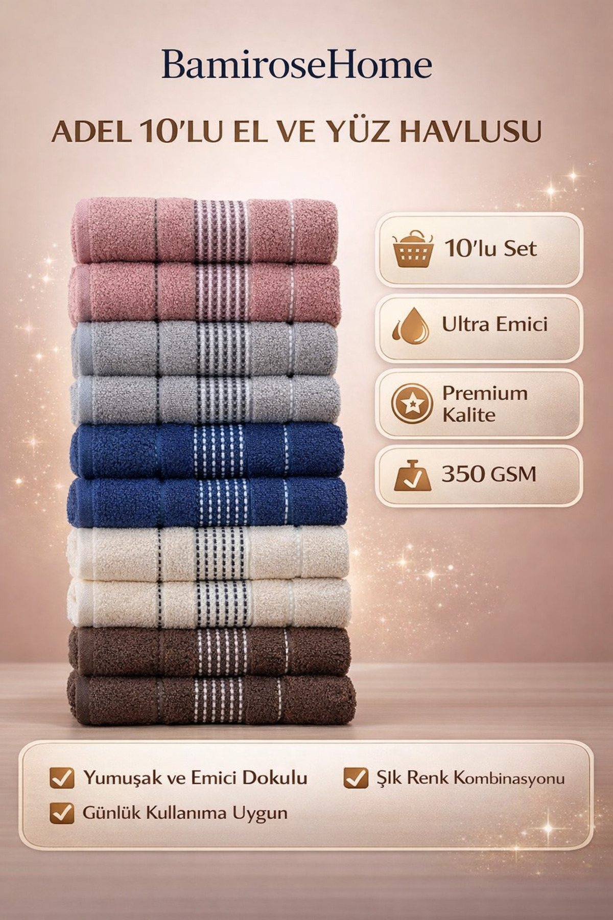 BAMİROSE 50×90 CM 10’LU ADEL EL & YÜZ HAVLU SETİ