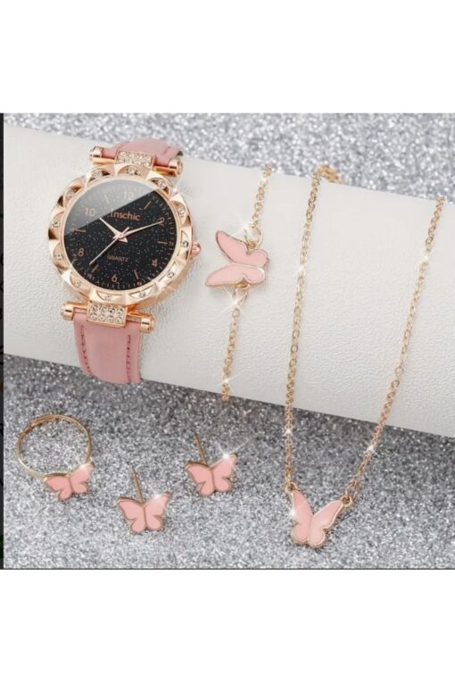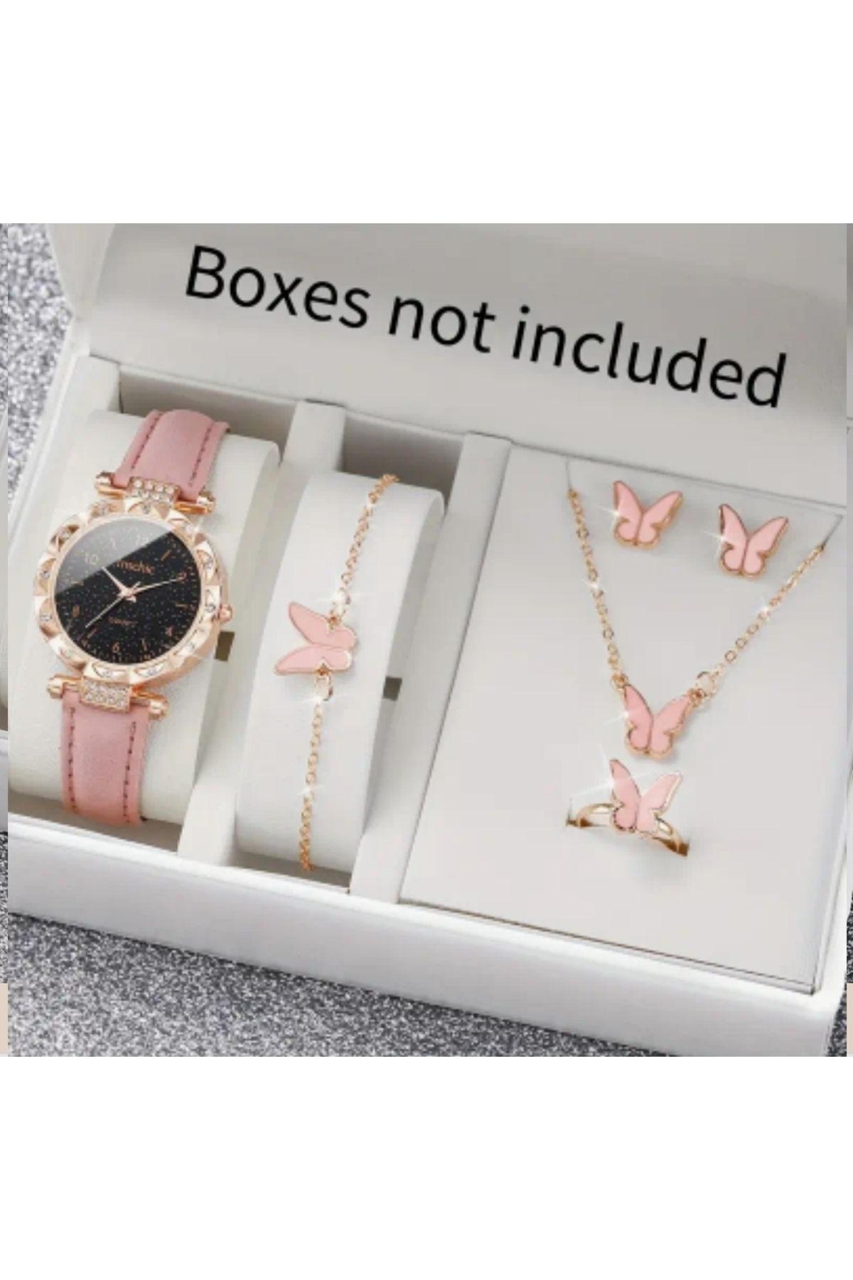 BBS 6 Parça Parlak Taşlı Kuvars Saat Bileklik Kolye Küpe Yüzük Takı Seti Kelebek Detaylı ( Kutusuz )