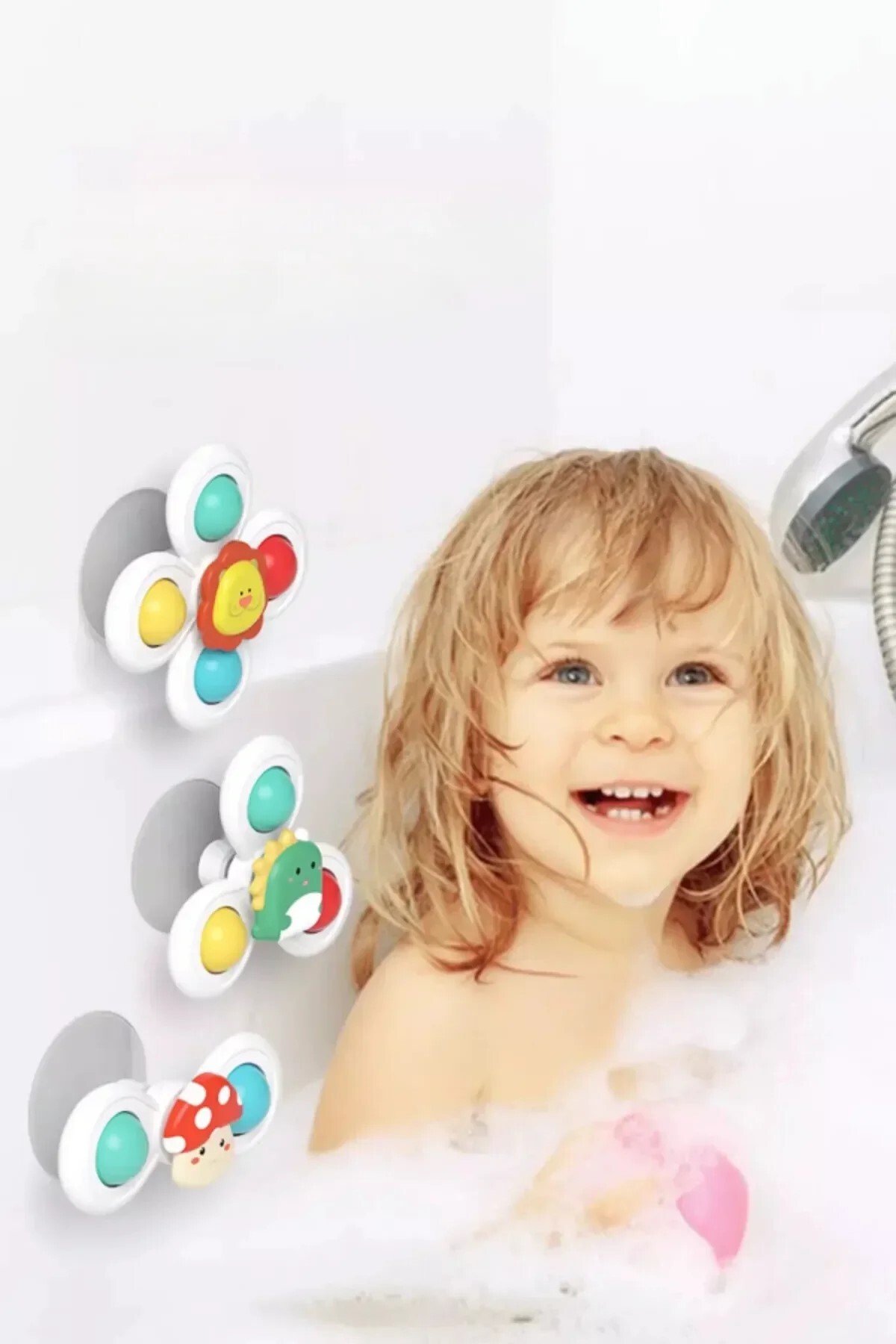 BBSKY 3’lü Bebek Vakumlu Döner Oyuncak Topaç – Hayvan Şekilli ABS Silikon Banyo ve Masa Oyuncağı