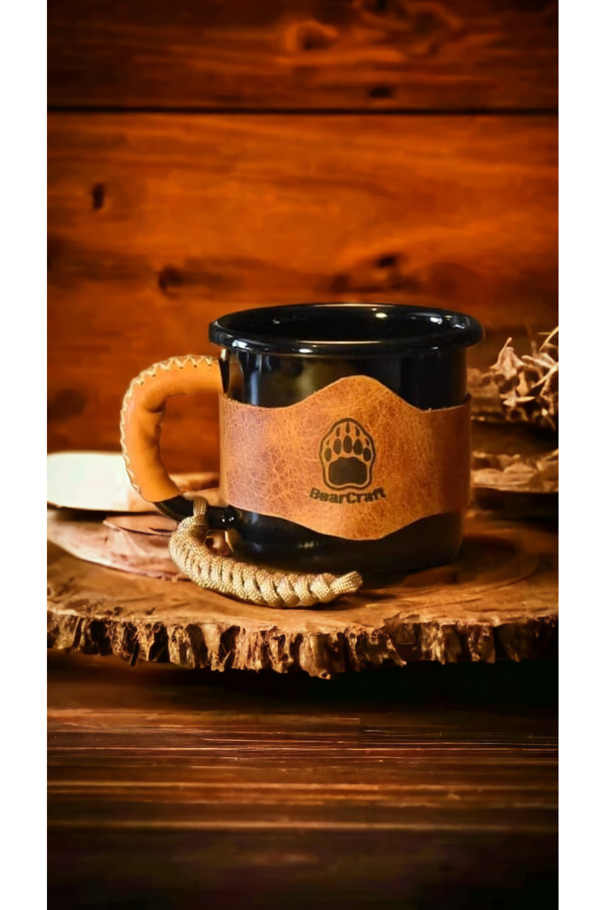 BearCraft Siyah Emaye Bardak ( Camel Renk Deri Kılıf)