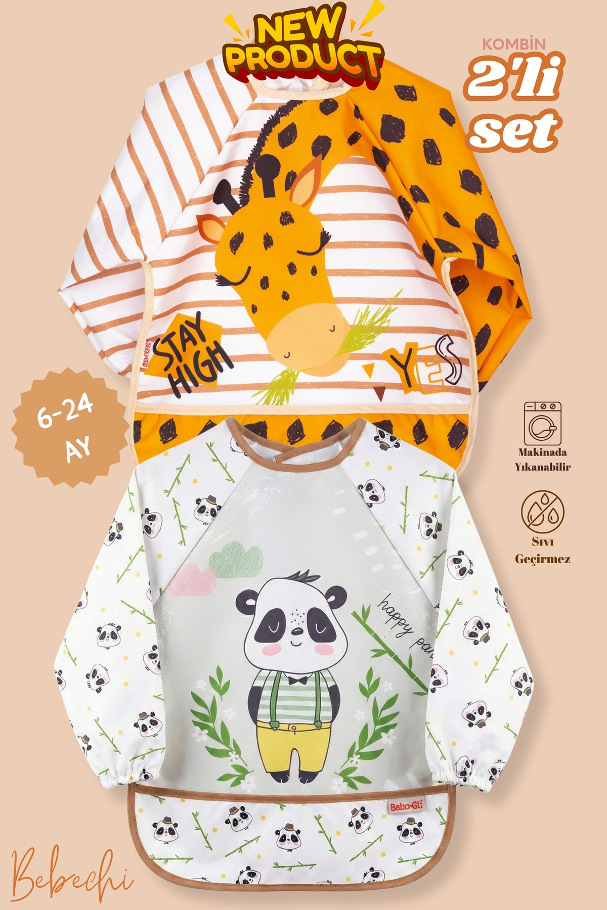 Bebechi 2’Li Uzun Kollu Giyilebilir Zürafa-Panda Desen Sıvı Geçirmez Aktivite ve Mama Önlüğü 6-24 AY
