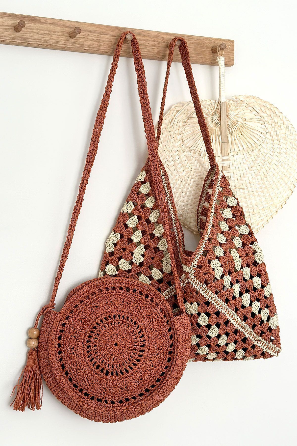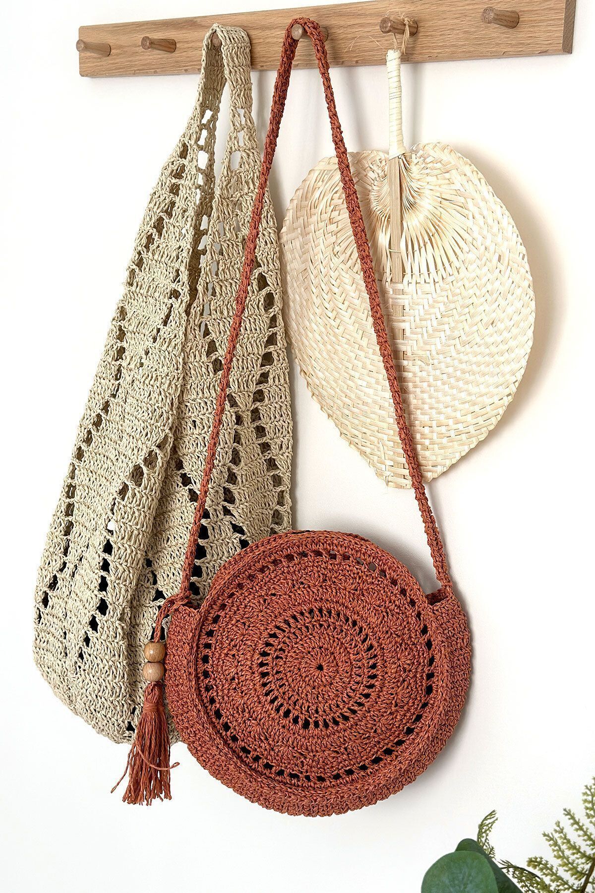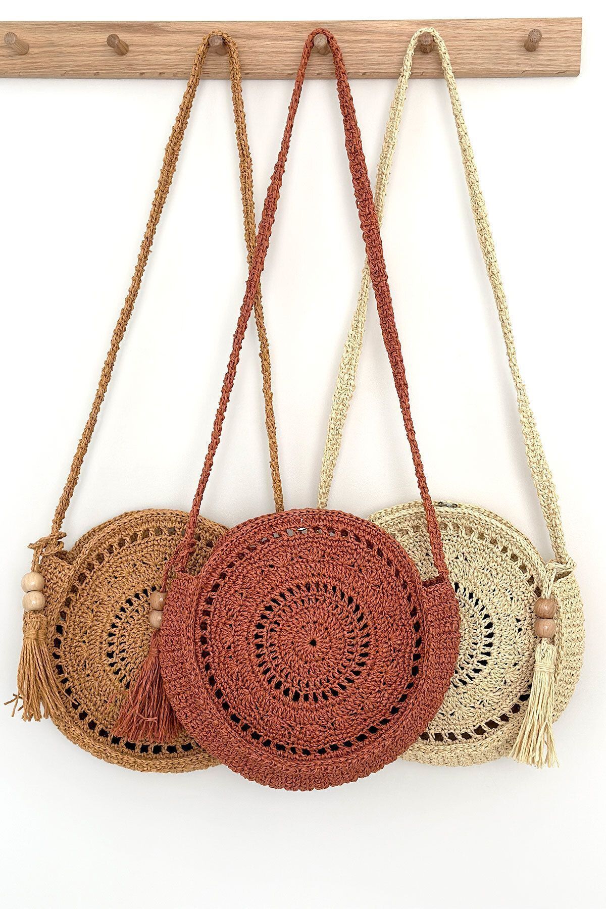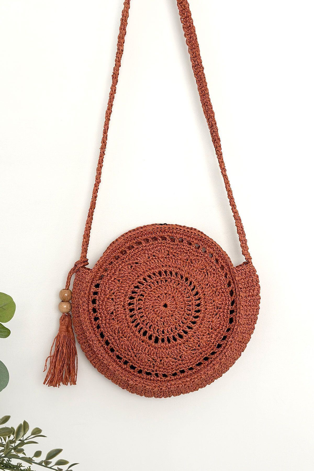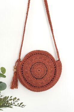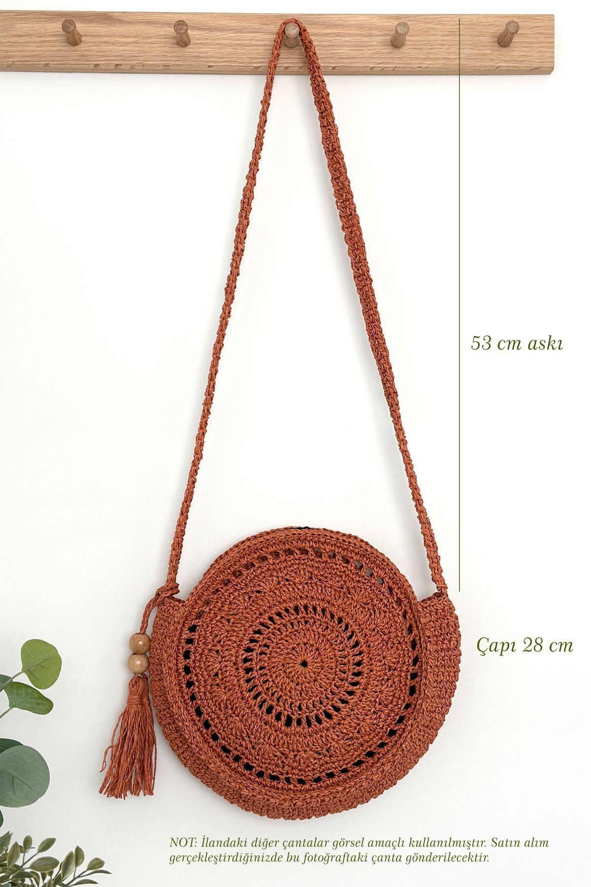 BECCASTYLE Yuvarlak Çanta, Makrome Çanta, Bohem Çanta, Püsküllü Hasır Çanta, Örgü Çapraz Çanta Kiremit Rengi