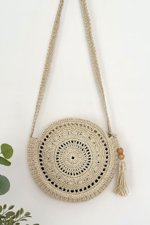 BECCASTYLE Yuvarlak Çanta, Makrome Çanta, Bohem Çanta, Püsküllü Hasır Çanta, Örgü Çapraz Çanta Krem Rengi Çanta