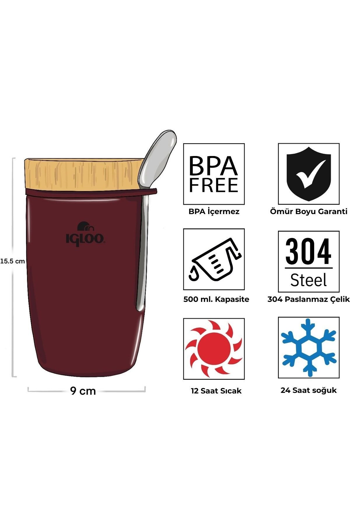 Begin Power Bambu Kapak Yemek Termosu 500ml Çelik Termos Bordo 12 Saat Sıcak Tutar