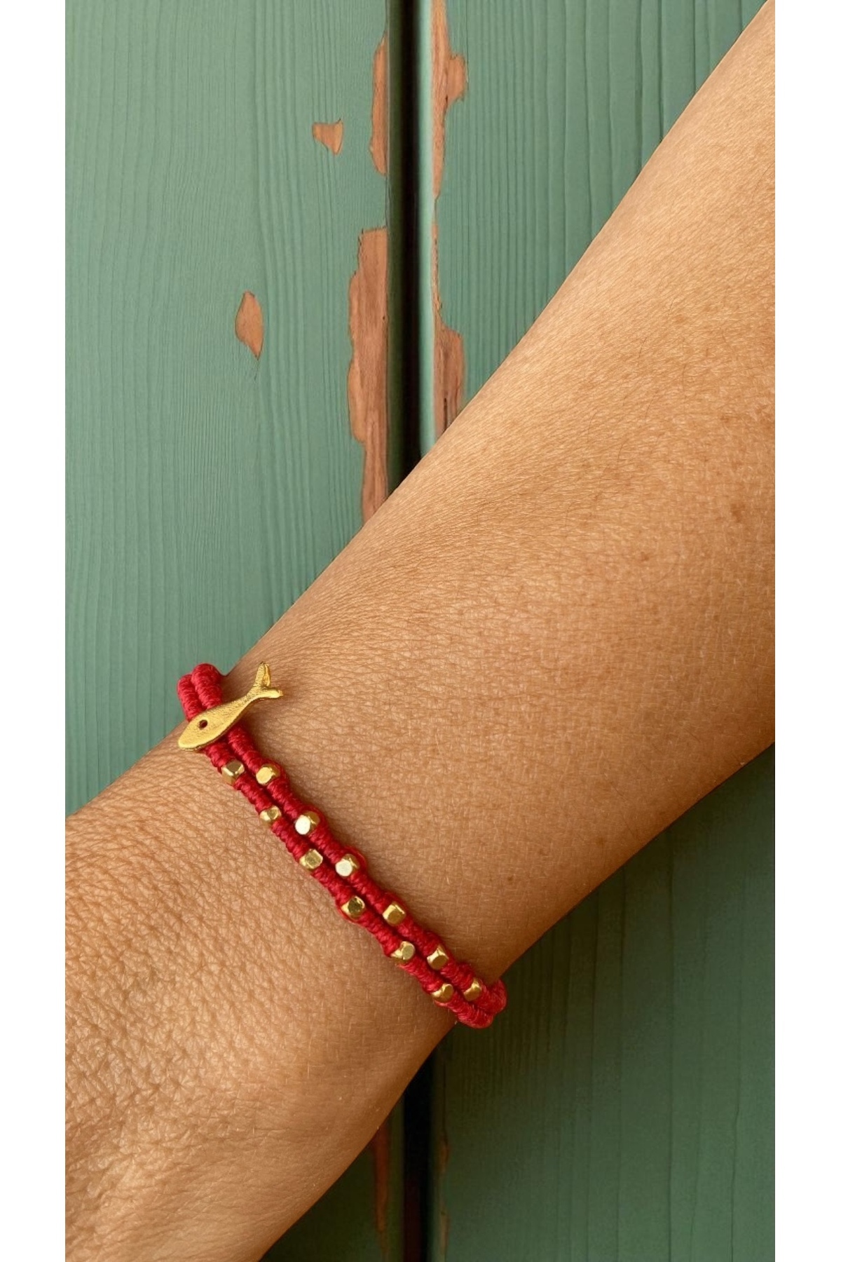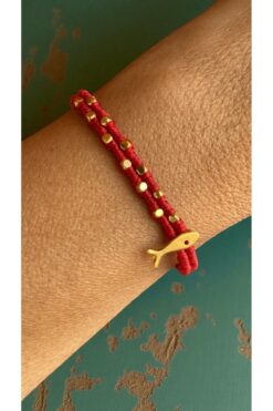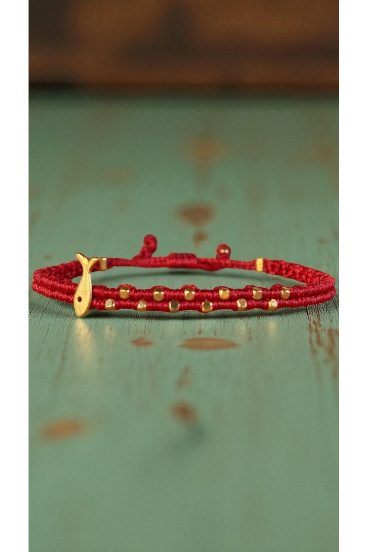Bensei Takı Dükkanı BENSEİ Pirinç Üzeri Altın Kaplama Balık ve Boncuk Aksesuarlı, Kırmızı Bileklik