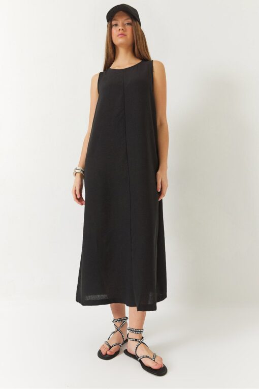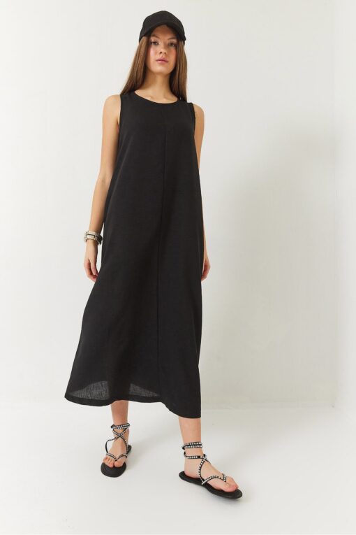Bianco Lucci Kadın Kalın Askılı Sırt Düğme Detaylı Yazlık Keten Elbise 353 60261430