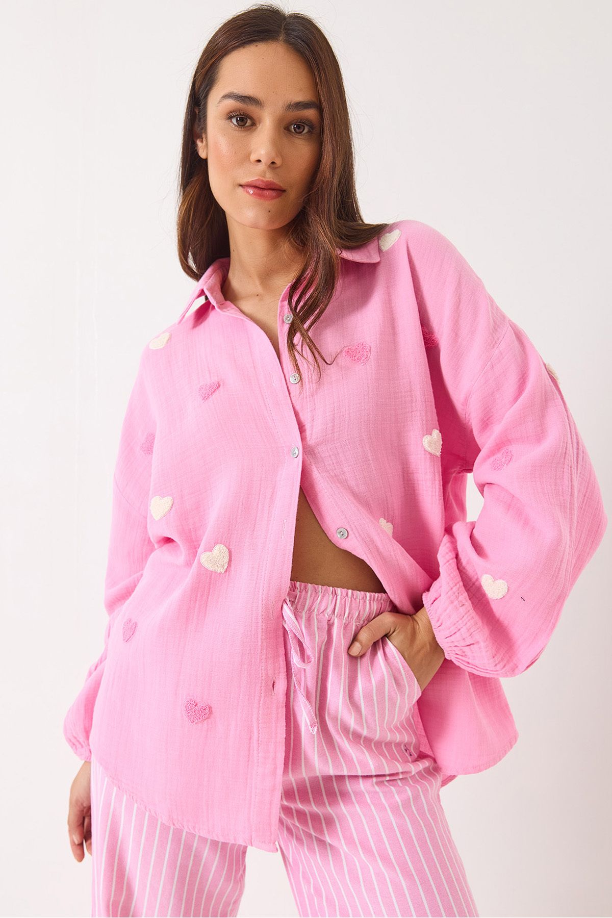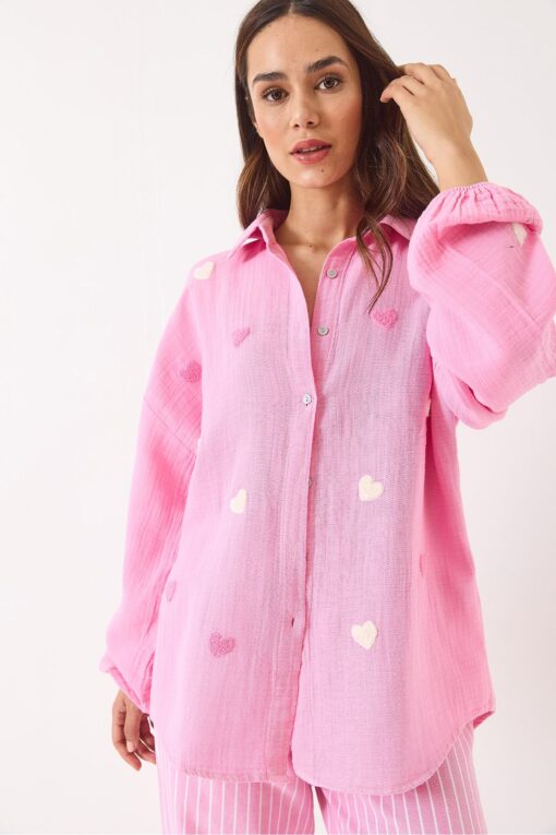 Bianco Lucci Kadın Süzene Kalp Nakışlı Overisize Müslin Gömlek 2036 60283052