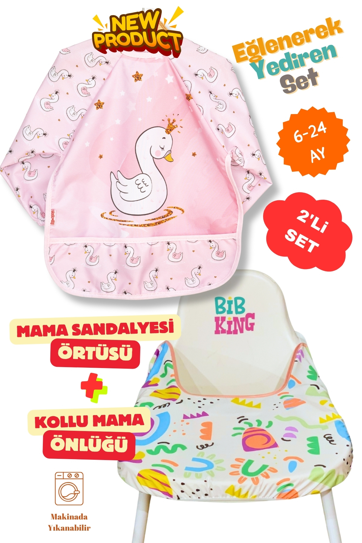 BibKing 2’Li Ekonomik Set Mama Sandalyesi Örtüsü-Kuğu Desen Aktivite ve Mama Önlüğü 6-24 AY